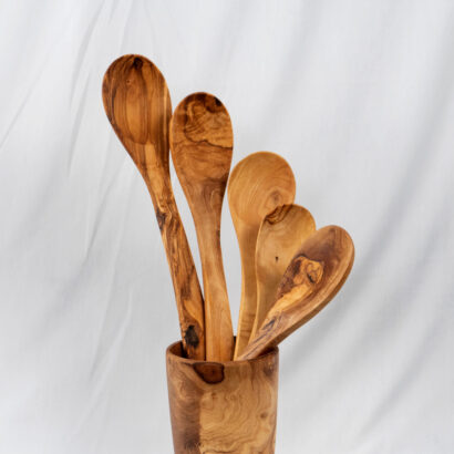 Ce set d’ustensiles de cuisine avec leur pot en bois d’olivier se démarque par son aspect très naturel.