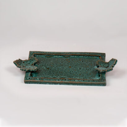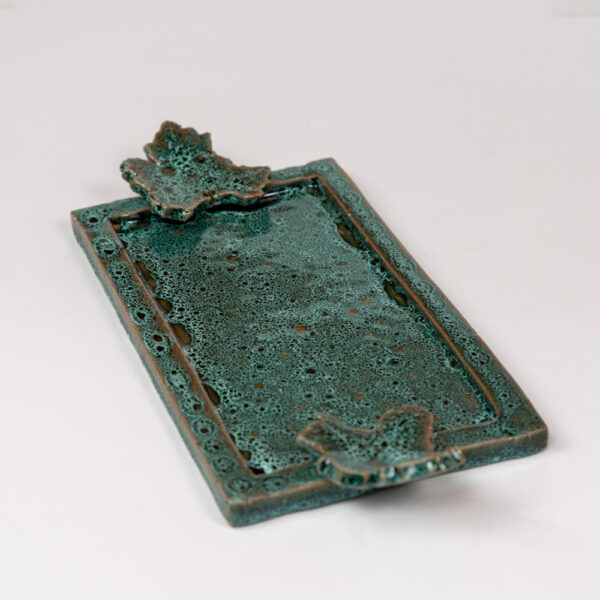 En teinte verdâtre et aux textures irrégulières, avec ses deux poignées en forme de feuilles, ce plateau en céramique reflètent le 100% fait main.