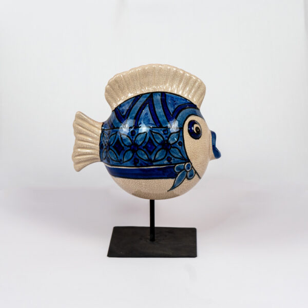 Ce poisson en céramique est une véritable œuvre artisanale, associant finesse et originalité. Monté sur pied métallique robuste, il devient une pièce décorative unique, idéale pour sublimer une table ou un buffet. Ses nuances de bleu et ses détails artistiques évoquent l’élégance et la sérénité du monde marin, faisant de lui un choix parfait pour un intérieur raffiné.
