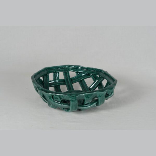 Cette corbeille en céramique est émaillée avec une structure ajourée tressée de couleur verte foncée et une finition brillante.